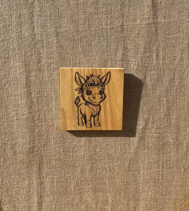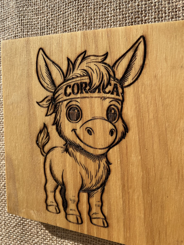 Le motif de l’âne est gravé au laser en profondeur pour un rendu précis et durable.