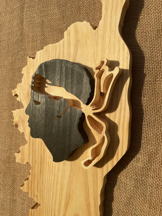 Je découpe la Corse en bois naturel qui sert de support, à l’aide d’une scie à chantourner, puis je découpe la tête de Maure que je peins en noir pour créer un contraste marqué.