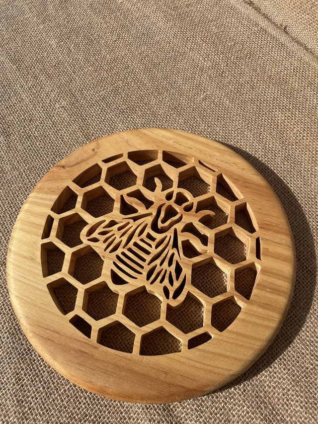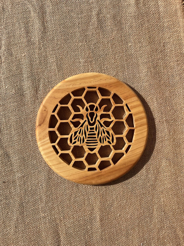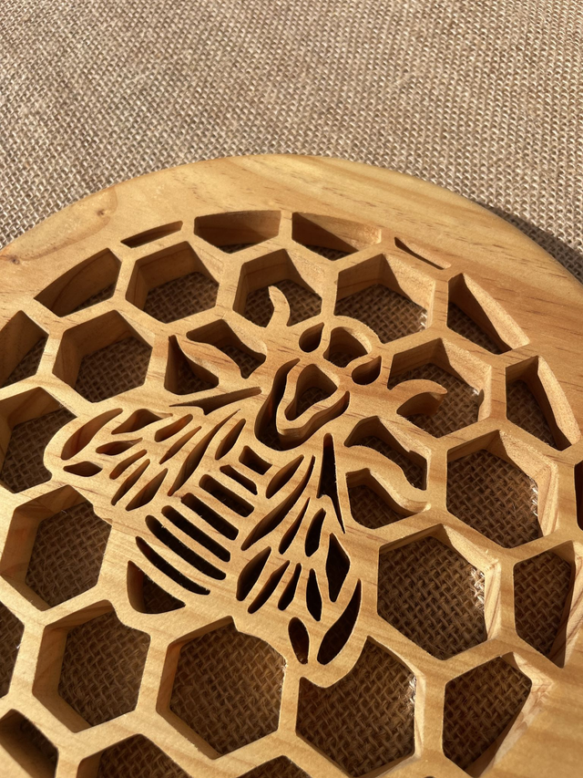Je découpe chaque dessous de plat à la main dans mon atelier, à l’aide d’une scie à chantourner, en travaillant le motif d’alvéoles autour d’une abeille centrale.