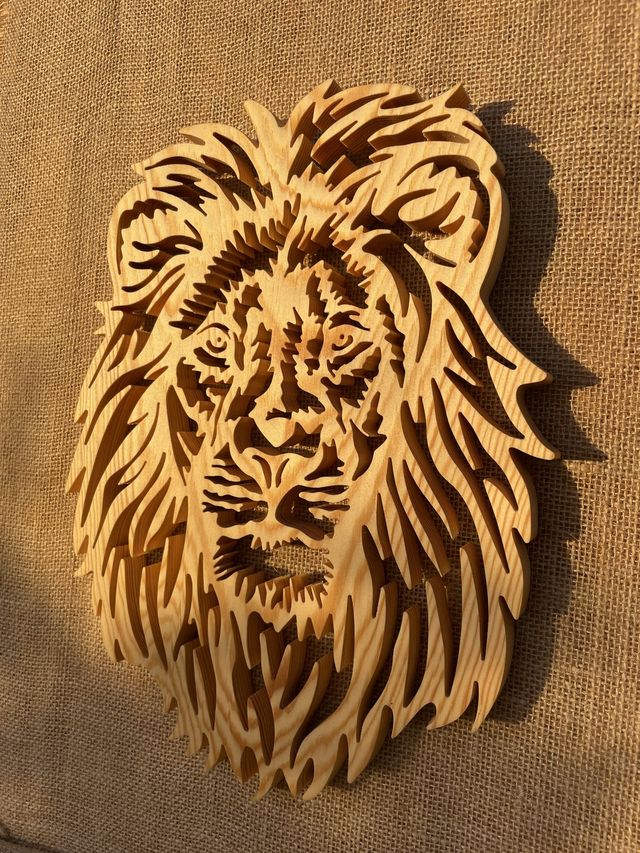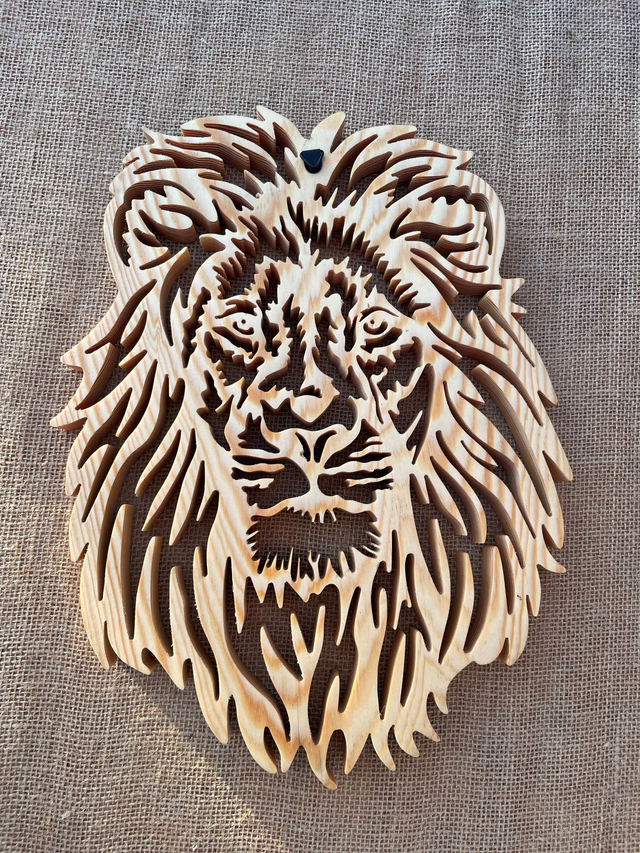 La silhouette du lion est découpée à la scie à chantourner, mettant en valeur sa puissance et l’élégance de ses lignes.