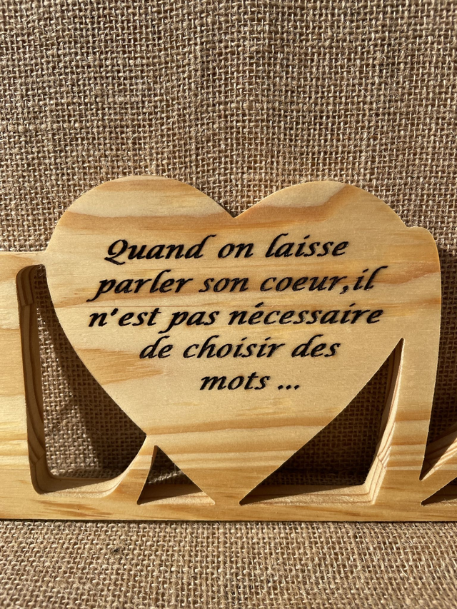 Dans ce cœur, une citation est gravée au laser, apportant une touche personnelle et poétique à la pièce.