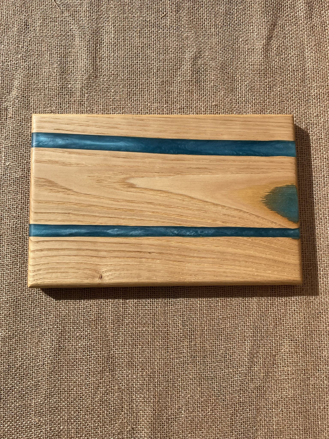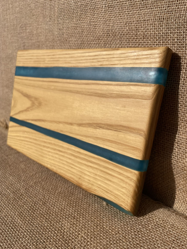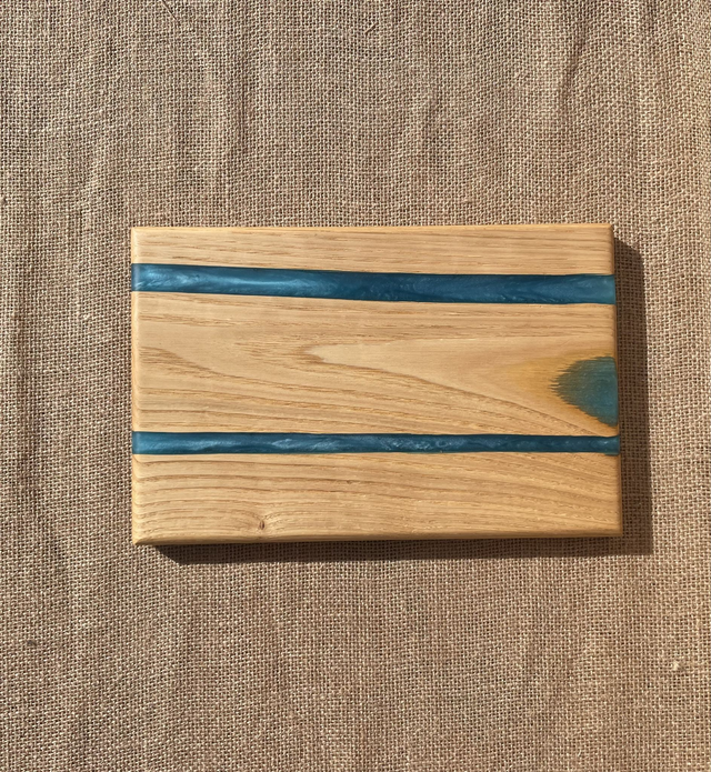 De la résine bleue est ensuite coulée dans les fissures naturelles du bois, apportant une touche lumineuse et élégante qui met en valeur la texture du châtaignier.