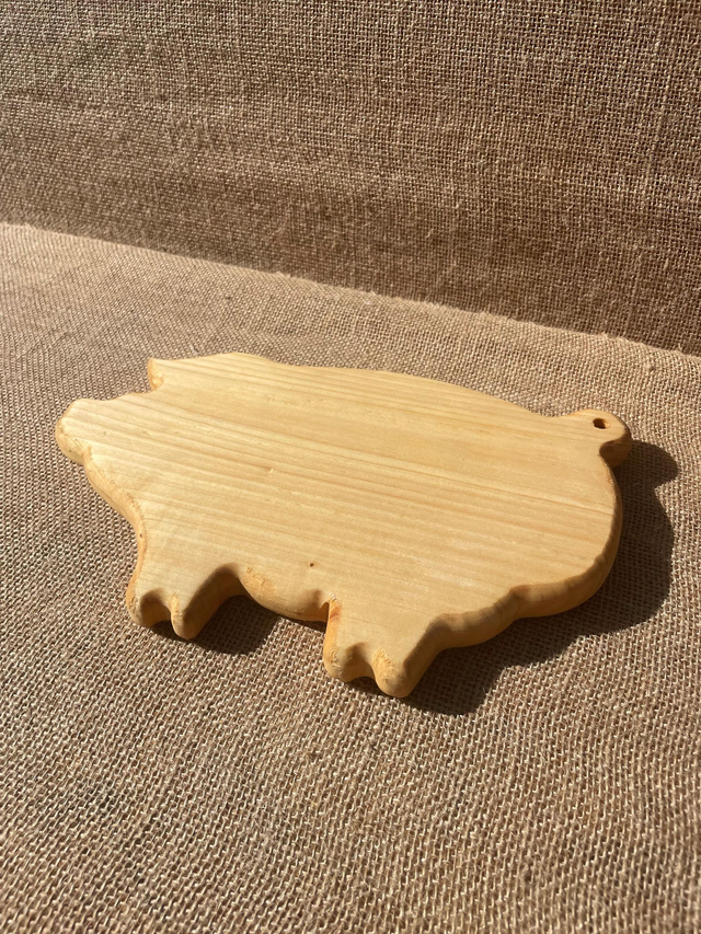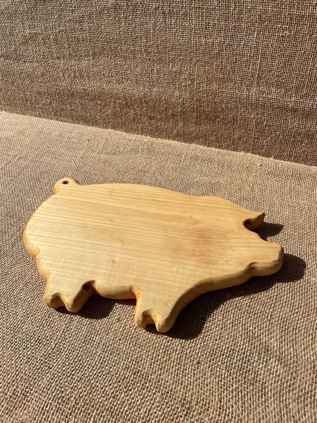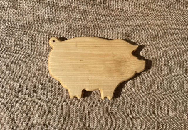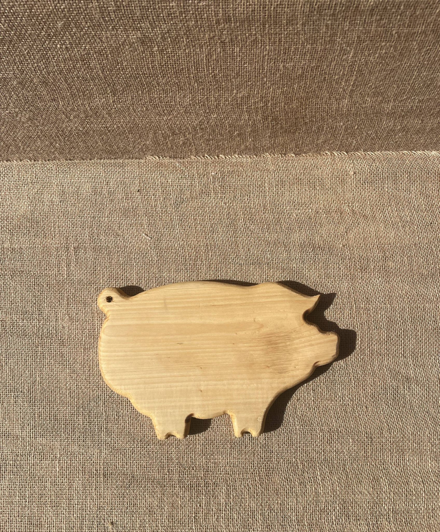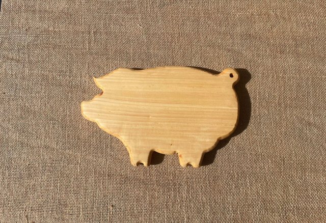 Je découpe chaque planche à découper à la main dans mon atelier, à l’aide d’une scie à chantourner, pour lui donner cette forme originale de cochon.