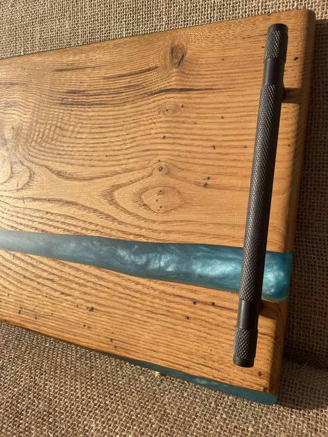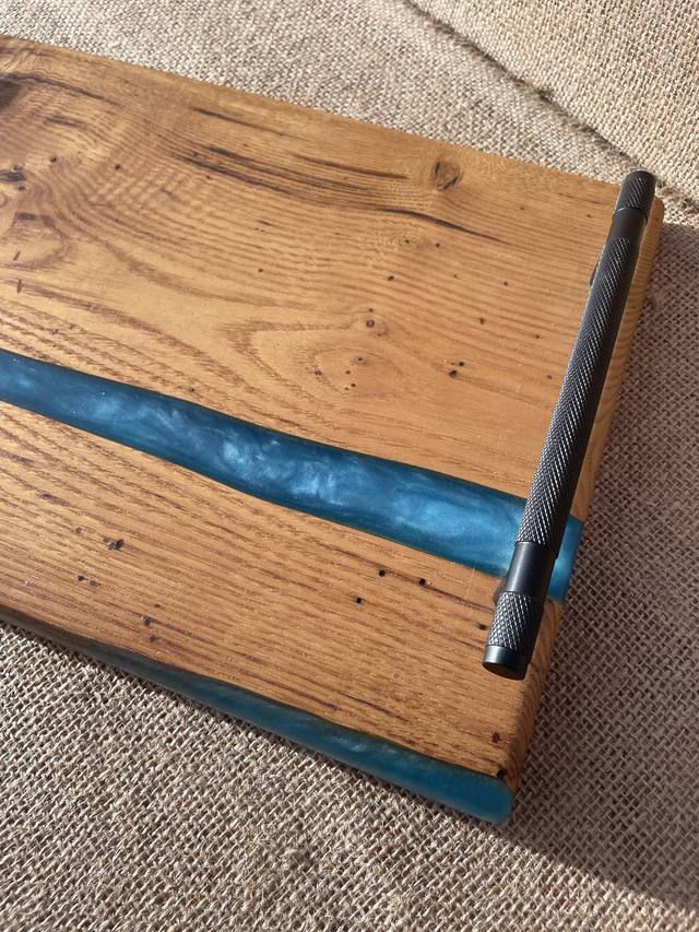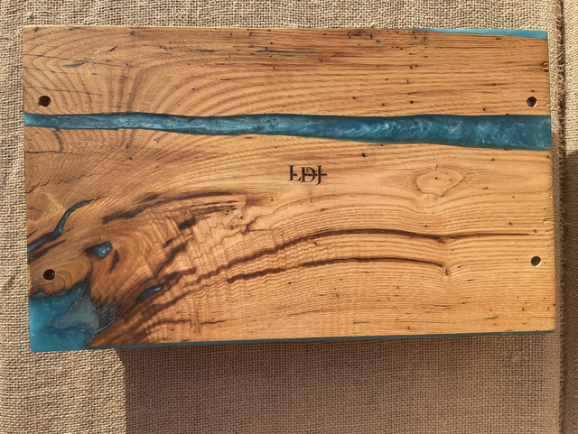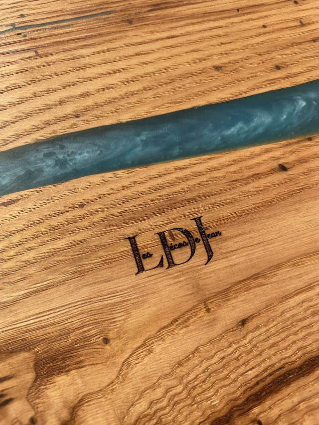 De la résine bleue y est coulée, créant un effet de profondeur et de mouvement qui contraste harmonieusement avec la chaleur du bois.
