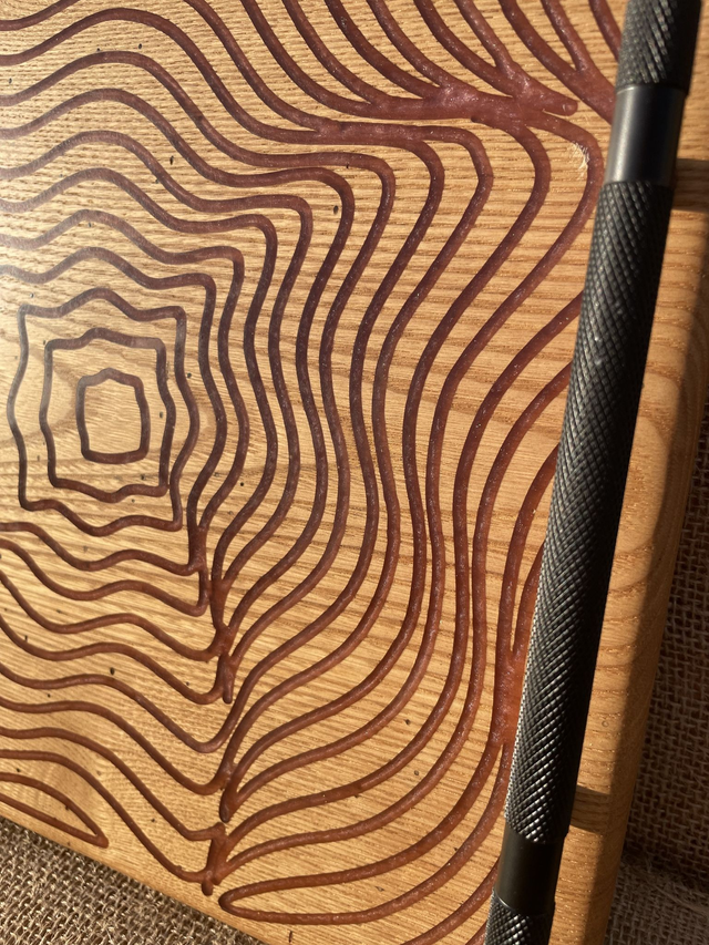 Des formes géométriques et psychédéliques sont creusées dans le bois, puis remplies de résine colorée, créant des motifs uniques et vibrants à chaque pièce.