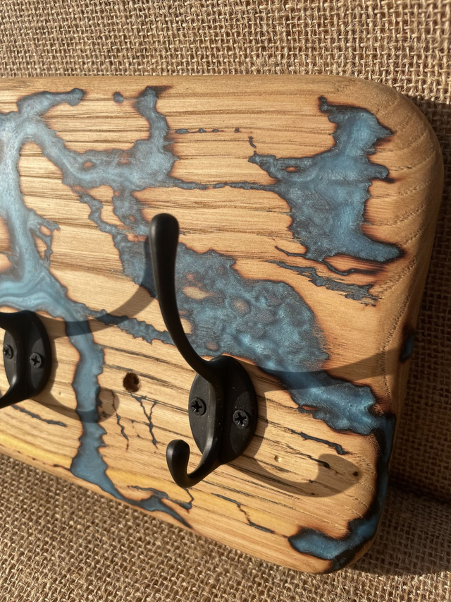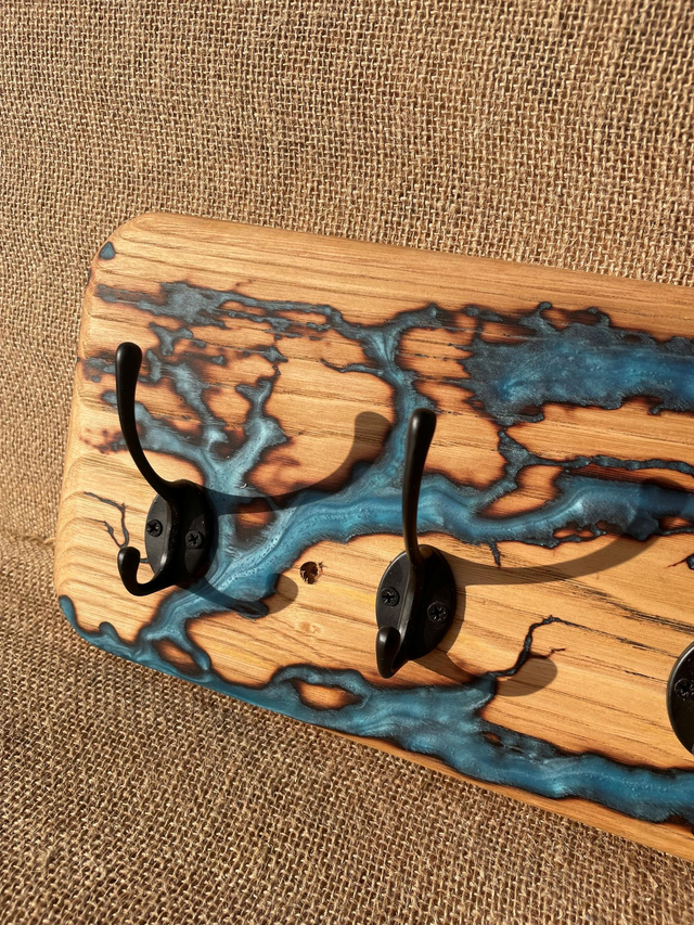 Ces lignes sont ensuite remplies de résine bleue, apportant profondeur et contraste tout en mettant en valeur la beauté du bois.