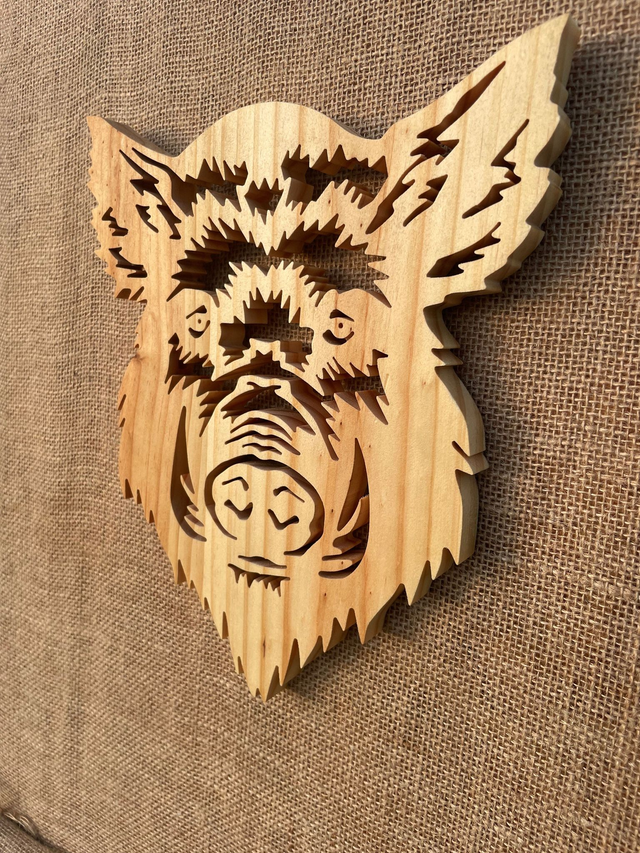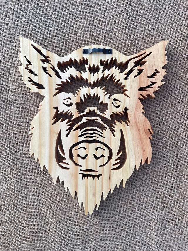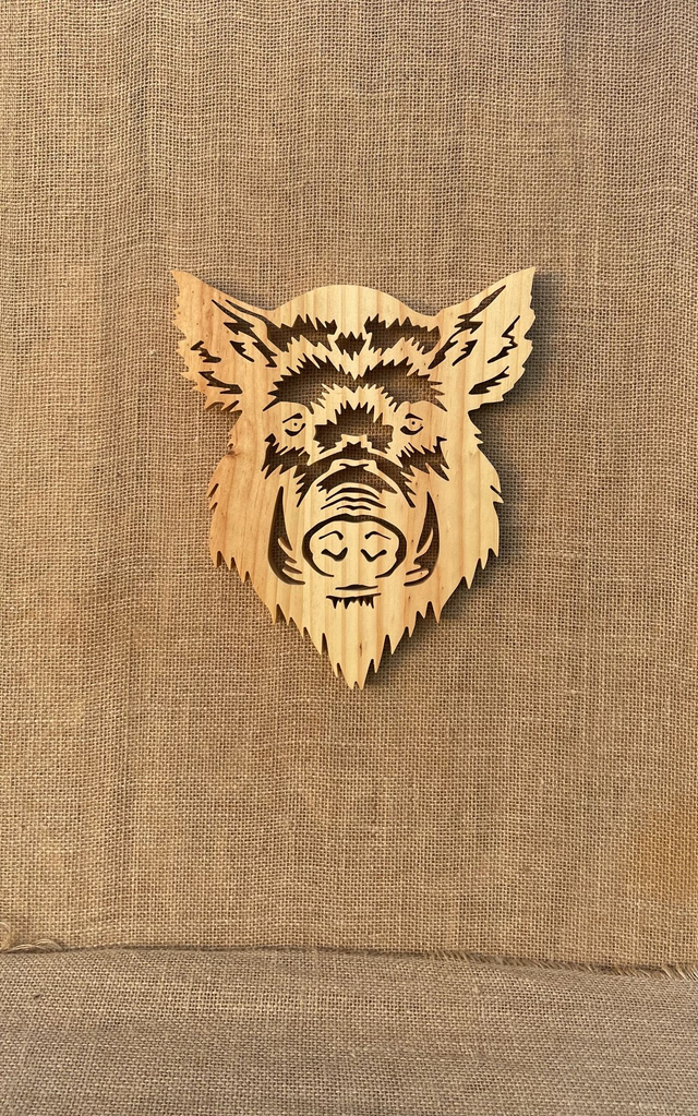 La silhouette du sanglier est découpée avec précision à la scie à chantourner, révélant tous les détails de l’animal.