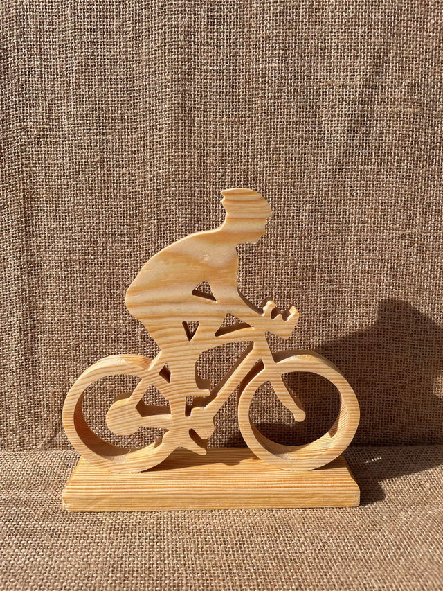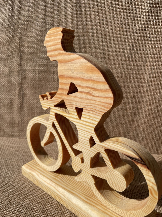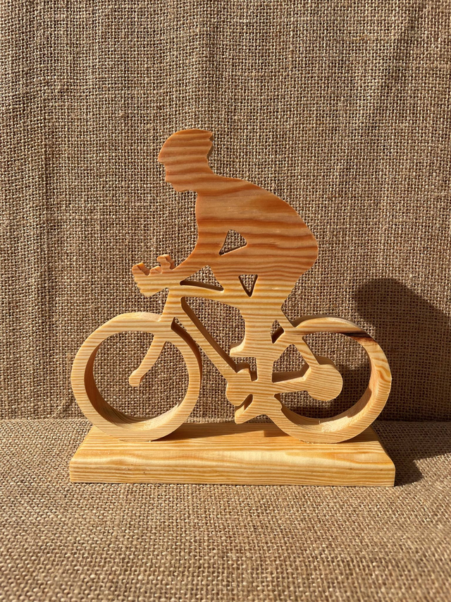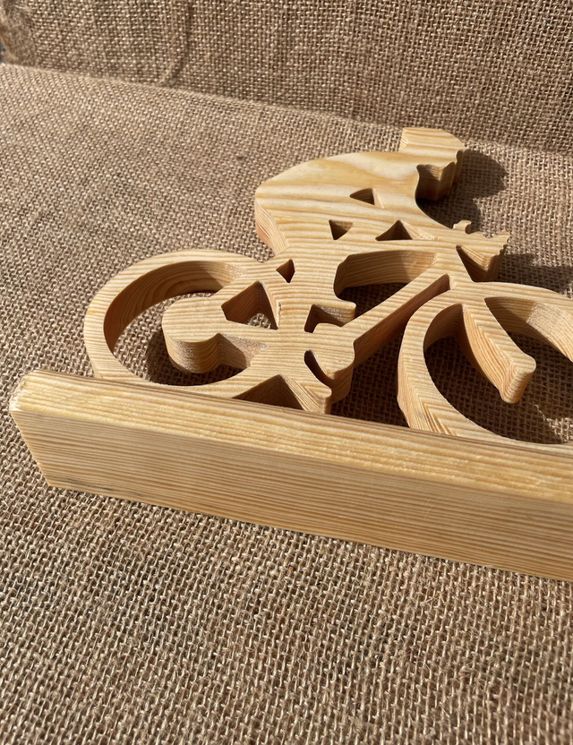 Chaque vélo est découpé à la main dans mon atelier à l’aide d’une scie à chantourner, avec une attention particulière portée aux détails pour un rendu précis et élégant.