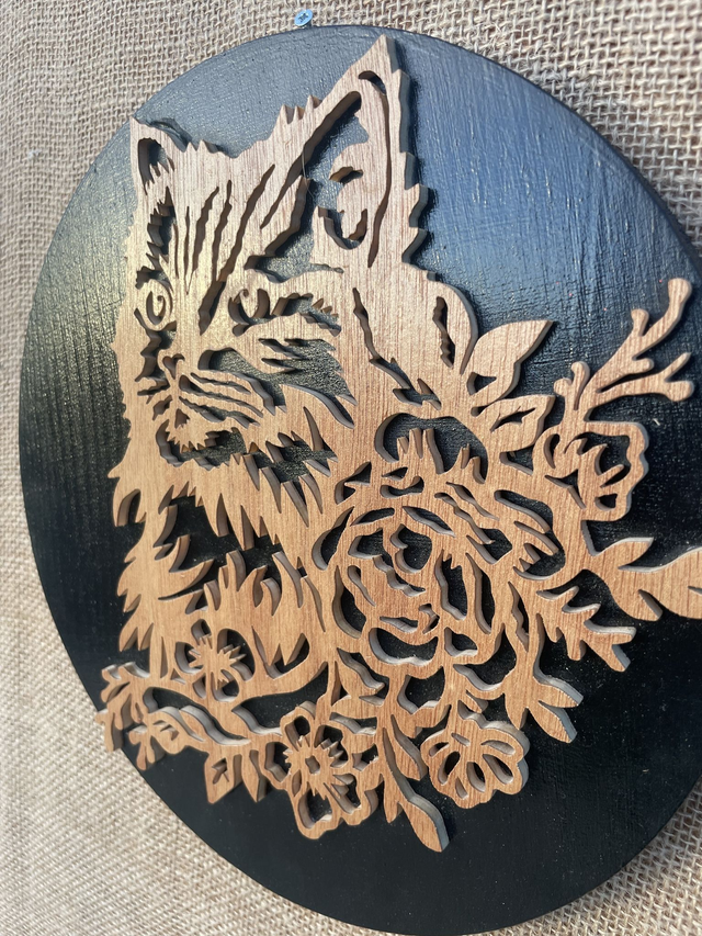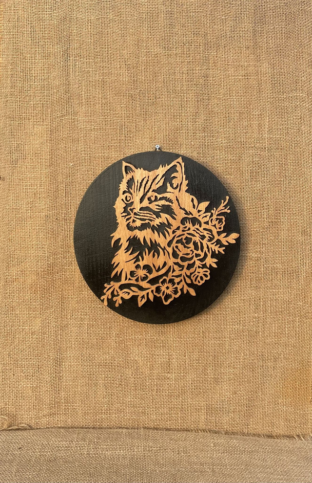 Je découpe un rond que je peins ensuite en noir, avant de façonner à la scie à chantourner la silhouette du chat dans du contreplaqué de qualité.